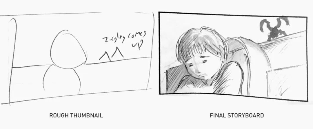 通常情况下,在电影制作流程中,故事板艺术家会直接和导演沟通,理解导演想要呈现出的画面,快速用简单的线条记录下重点,之后再进行反复修改和完善,直到最终通过。