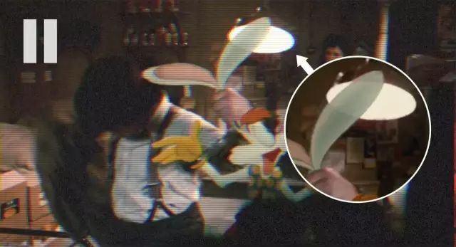 我们再来看看兔子罗杰和私家侦探埃迪·瓦林特来到工作室的情景,罗杰的身高设定大约有三英尺高,这里罗杰和瓦林特的视线没有对上,犯了《欢乐满人间》里同样的错误。