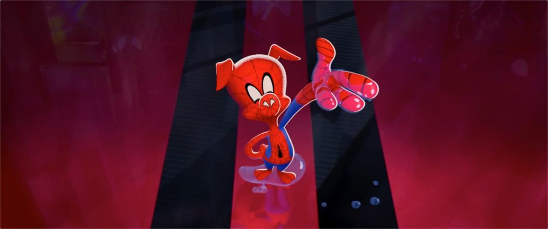 蜘猪侠则呈现出我们以前在《兔八哥》和《猫和老鼠》等滑稽动画中常见的卡通表演方式,比如这个握手的动作,你可以看到角色的姿态呈现出非常有卡通感的曲线,以及他伸手的动作,都非常有卡通感。
