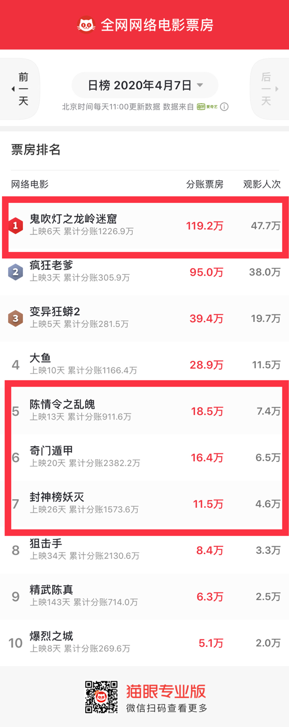 从近期作品可以看出,《鬼吹灯之龙岭迷窟》与剧版作品同步上映,6天票房达到1226万。《奇门遁甲》累计分账2382万左右,《封神榜妖灭》累计分账1573万。这些作品是3、4月网络电影电影的中坚力量,它们或改编自经典IP作品,或取材于经典传统故事。