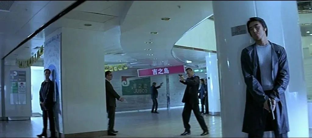 下面要看的是杜琪峰作品中最有名的场面之一,俗称“吉之岛枪战”。地点是九龙半岛西北角附近的荃湾(Tsuen Wan)的某个吉之岛商场(追溯相关信息,查明了该场景的拍摄地点)。商场内的墙壁上可以看到“吉之岛”的字样,在粤语里指的就是“JUSCO”②的意思。