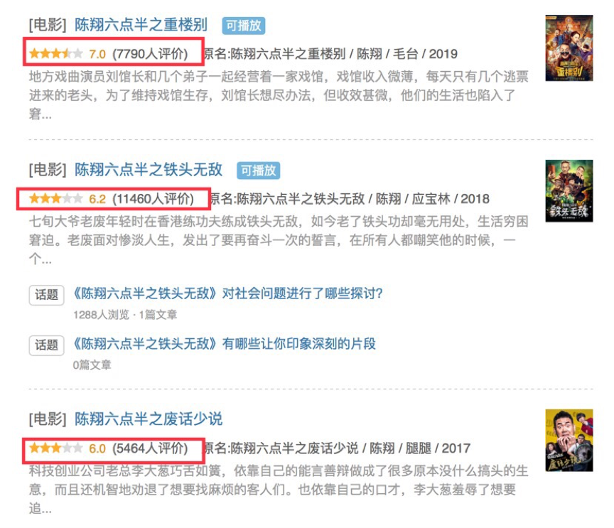 原生内容与IP改编作为网络电影重要的创作方式,二者几乎对半分。其中原生内容经过发展也不再是“一锤子买卖”,为了保证内容的存续发展,系列化已成常态,10部网大,至少5部片名中带着“之”字。《二龙湖浩哥》系列从2012年推出,至今已经8部;《大蛇》第一部获得了5000万票房记录,如今第三部正在筹备中;《陈翔六点半》系列网络电影至今已3部,票房都在千万以上,且最高口碑达到了豆瓣7.0分。这让我们看到原生IP的巨大潜力,与单部影片相比,系列化网络电影爆发力更强、影响力更久,用户粘性更高。在所有原生内容的系列化项目中,《陈翔六点半》非常典型。导演陈翔带着自己的团队,通过短视频积累了一定粉丝之后,沿着“短视频-网络电影-院线电影”的道路一路进军。从2017年推出第一部网络电影至今,其推出3部作品,每一部作品都表现良好。可以说“陈翔六点半”用3年的时间为这个经典IP注入厚度和宽度,实现了短视频IP的升级,并且还在不断扩大和加固。《陈翔六点半之废话少说》 2017年4月 分账票房1239.2万《陈翔六点半之铁头无敌》 2018年6月 分账票房 2371.9万《陈翔六点半之重楼别》 2019年7月 分账票房 1858万接下来,我们将解析“陈翔六点半”这个IP从短视频实现一生二,二生三,延续出如此多形态网生内容的方法论。拍网络大电影之前,“陈翔六点半”以短视频形式风靡于网络,早已是短视频领域的知名IP。2014年,陈翔辞掉了在大家看来稳定而体面的电视台工作,一头扎进短视频创业中。2015年初,上线了《陈翔六点半》第一支视频,陈翔算是短视频领域较早的入局者,在2017年短视频的风越刮越猛时,节目的生命力也越来越强劲。《陈翔六点半》不是传统意义上的情景喜剧,有灵活的场景和固定的时长,每集均有至少一个笑点,时长一到三分钟,由一到两个情节组成。如今,《陈翔六点半》已走过5个年头,在短视频领域扎根越来越深。也形成了自己独特的IP印象。《陈翔六点半》上线后,目前,在42个平台上播放,全网每月累积播放量达十亿次,全网的粉丝量已经超过2000万,其微信公众号“六点半”头条阅读量几乎都会达到10万+ 。尤其在QQ空间、今日头条平台,成为《陈翔六点半》的主要阵地,其中在今日头条的粉丝为5666.4万,可见在广撒网的同时,也有侧重点。陈翔在《生机》纪录片中举例说,选择今日头条作为重点运营的平台,因为《陈翔六点半》内容大众化,更适合今日头条这样的国民级平台。我们了解到,《陈翔六点半》在今日头条视频每一集的播放都在百万次,评论从几百到几千不等。通过多渠道运营,重点布局,让陈翔六点半波及更广的受众,同时也培养起了死忠粉。包括短视频,陈翔逐步构建起了一个六点半家族体系,除了《陈翔六点半》之外,还有爆笑短剧《六点半日记》、爆笑动画《六点半变变》。《六点半日记》是在《陈翔六点半》的基础上延伸创作,导演同样是陈翔,播放类型仍以迷你剧的形式播出;动画《六点半变变》则以动画的形式,搞笑的内容打入二次元圈子。从这些布局可以出,“陈翔六点半”IP已通过多种内容形态强化其IP印象。由此,我们认为《陈翔六点半》IP的本质是“内容”,抓住了内容领域的短视频风口,形成了强大的IP,获取了巨量的粉丝,从而实现商业价值变现以及后续的衍生内容。对于当下很多原创内容来说,无论是短视频内容、形象IP、经典故事以及真实故事等,但凡能够实现粉丝聚合这一基础,就首先拥有了IP不断衍生的价值。先有“一”,让原始IP内容需要具有较强的用户基础和粘性,那么接下来到网络电影-电影-游戏-IP衍生品等多种形态的转化就顺理成章了。《在陈翔六点半》短视频被大家广为熟知的情况下,他们开始布局网络电影。