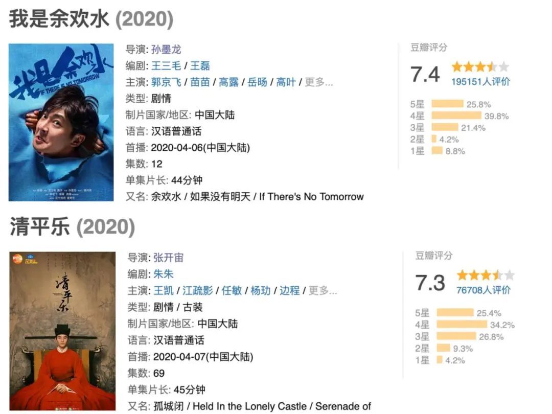 不过,虽然遭遇了口碑危机,但无论评分网站还是社交媒体,《我是余欢水》和《清平乐》本身的主题、表演与质感还是获得了认可。尤其在豆瓣出现大量「恶评」后,两部作品的评分还能维持在7分以上,超过国产剧平均水准。