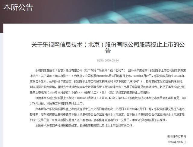 近日,深交所发布公告称,乐视网信息技术(北京)股份有限公司因2018年度经审计的归属于上市公司股东的期末净资产为负值,公司股票自2019年5月13日起暂停上市。根据本所《创业板股票上市规则(2018年11月修订)》第13.4.1条、第13.4.6条的规定以及本所上市委员会的审核意见,2020年5月14日,本所决定乐视网股票终止上市。(钛媒体)