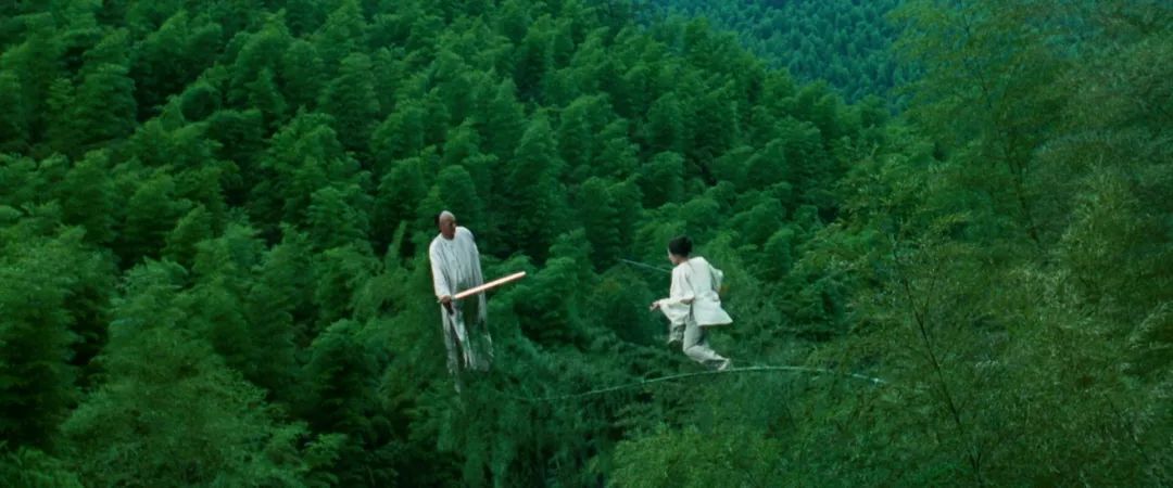 而在电影《卧虎藏龙》中,摄影指导鲍德熹拍摄了许多令人惊叹的打斗场面。这些打斗大都发生在摇曳的竹海中,深绿色的竹海和身着白衣的人物形成鲜明的对比,勾勒出来两人的轮廓,使得打斗戏份充满了东方诗意。