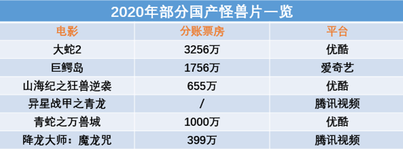 值得一提的是,尽管2020年的网络电影市场中出现了不少类型、题材各异的高票房作品,但就各平台发布的榜单来看,玄幻、魔幻等元素仍是市场主流。而在这些类型分支下,怪兽片作为一个亚类型题材,显然有着其自身优势,将具有一定视觉冲击力的“奇异巨兽”与奇幻、惊悚乃至悬疑等类型元素进行有效嫁接,也是这类电影持续走红的原因。而自2018年《大蛇》诞生以来,曾经不受追捧的怪兽片已经逐渐被市场接纳,并屡次创造票房佳绩。