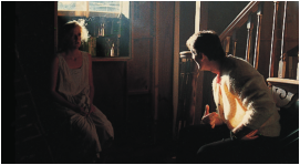 许多人也许会将杰夫·克罗嫩韦斯的黑暗风格与其早期为芬奇担任操作员,或是跟随达吕斯·康第拍摄《七宗罪》这样的经历联系在一起。事实上,这似乎是一项家族事业——在他两次赢得美国电影摄影师协会奖(ASC Awards)的父亲乔丹·克罗嫩韦斯(Jordan Cronenweth)的职业生涯中,“少即是多”是一条重要信条。“使你独树一帜的,不是你决定打亮什么,而是你决定不打亮什么。(It’s not what you light, it’s what you don’t light that separates you from everyone else.)”在杰夫·克罗嫩韦斯的描述中,这是父亲令他印象最为深刻的一句话。“年轻的摄影师总会犯这样的错误——过度照明。其实你可以用最简单的方式照明场景,仍然能得到很棒的结果。”在南加州大学的工作坊课程上,乔丹·克罗嫩韦思如是说。这场戏中,克罗嫩韦斯使用了一个巨大的背光,并在演员斜前方放置了一块聚乙烯板,将光反射到演员的脸上《银翼杀手》以低调、烟雾和霓虹著称的视觉风格影响了后来整整一代的摄影师。而除了最为著名的《银翼杀手》,为科波拉拍摄的《佩姬·休出嫁》(1986)同样也是乔丹·克罗嫩韦斯为人所熟知的代表作,这部作品曾为他带来美国摄影工会奖和奥斯卡金像奖两项大奖。在工作坊课程上,克罗嫩韦斯带领学生们一同回顾了他如何只用一盏灯得到片中地下室一场戏的杰出效果。这部电影是《回到未来》(Back to Future,1985)和《魔镜之旅》(Through the Looking Glass,1976)的混合体。影片情节是:婚姻不幸的女主角佩姬·休,在毕业 25 年后参加高中同学聚会;在聚会上,她兴奋得昏了过去,醒来后发现自己穿越到了 60 年代,重新回到 18 岁。命运给了她重头来过的机会,重温叛逆青春之后,她和丈夫也重温了鸳梦。工作坊要重现的这个场景,是重返青春的佩姬·休偷跑到父母家的地下室里抽烟。对她种种异常举动感到费解的男朋友,也跟着她来到地下室,想当面问个清楚。科波拉在拍摄佩姬·休娘家场景时大部分用的是实景,是在真正的房屋里拍摄的。这就给摄影师带来了一个棘手的问题,场地太狭小,灯光设备施展不开。克罗嫩韦思用一个简单的办法解决了这个问题,并在此次工作坊中重演了整个过程。“单一光源照明往往是不得已而为之的选择。我们当时拍摄的那个地下室只有一扇窗户,如果我在室内布光,就得藏很多小灯,不方便且效果很假,所以我想干脆只用一盏灯好了。窗户提供了解决的方案,至少值得一试。”克罗嫩韦思在窗外支起了一盏功率是 10K的钨丝灯,用来模拟月光。他在阴影处放烟,利用烟雾对光线的反射来提供一部分辅光,一块正对着窗户的小反光板用于提供更多的反光。整个场景最有趣的部分是大部分辅光都是演员自己提供的:男演员身上穿着黄色的毛衣,当他走向窗户边的女主角时,毛衣上的反光为女主角的脸部提供了额外的补光。演员凯特·霍尔和比尔·布雷迪重现了《佩姬·休出嫁》中的场景整个布光计划非常大胆。摄影机与窗户略呈夹角,窗外的 10K 灯从左至右照进室内,勾勒出楼梯等道具与布景的轮廓。烟雾提供了最低程度的辅光。女演员背对着窗户坐在床边,脸部位于暗区边缘,男演员与她相对而坐,灯光勾勒出他的侧面轮廓,画面很有张力。场景的亮区过曝,而其他的区域则几乎是全黑的。