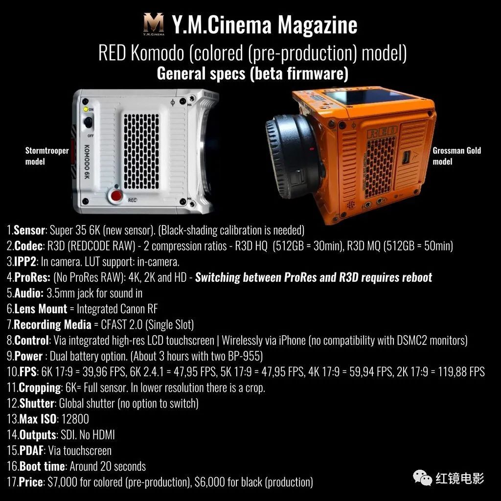 一直备受关注的RED Komodo 6K限量特别版已经宣布上市两周,不少大佬级用户已经收到了订购的新机,同时也流传出几段开箱测试。今天,我们总结了几款开箱视频的内容,就RED Komodo 6K的录制格式全域快门、最高帧率、自动对焦、防抖功能、SDI接口、高ISO、编码和压缩格式等等方面的信息做一下简要分析和总结,以方便大家更精准的进行选购。RED Komodo 6K 限量特别版 VS 正式版的区别2、颜色上限量特别版有多种定制颜色,而正式版则为黑色- RAW编码:R3D HQ(512GB可录制30分钟),R3D MQ(512GB可录制50分钟)