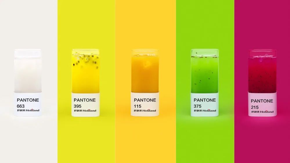 好利来和色彩大佬潘通在2016年跨界合作的一系列甜品,海报灵感取自各种水果颜色,主体和背景颜色统一,带来感官上的冲击。