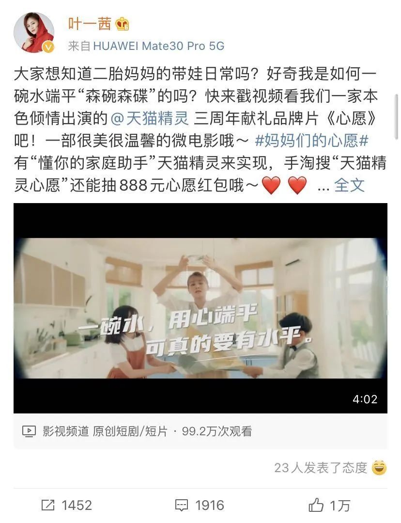 另外,通过叶一茜来讲述这则故事也非常契合天猫精灵这次“懂你的家庭助手”核心定位。与其说“懂你”,不如说天猫精灵这次太懂妈妈群体了。众所周知,叶一茜既是一位称职妈妈,也是一位优秀演艺者,她代表了广大女性群体,既想照料好家庭的同时也能活出自我,再深层次理解也是在致敬生活中伟大的母亲。
