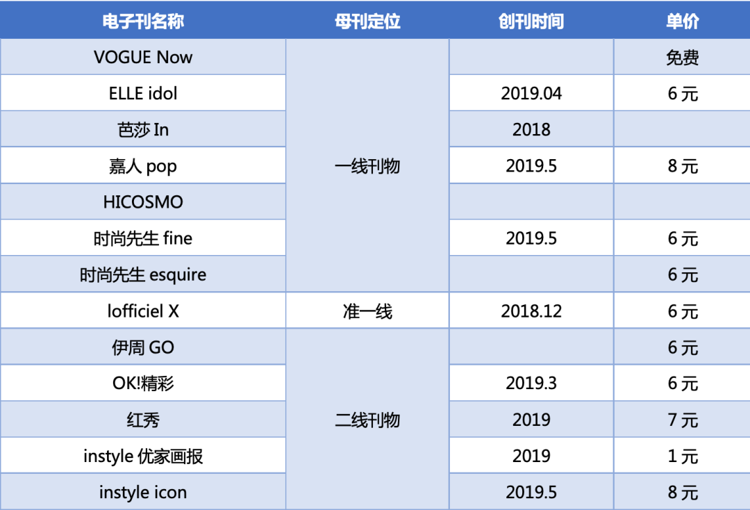 上至一线时尚杂志,下至三线时尚杂志均有品牌涉足电子刊市场。一线时尚杂志除了《智族GQ》之外,其他品牌均已经开始运营电子刊项目,准一线有《时装 lofficiel》,二线杂志有《红秀》《伊周》《OK!精彩》《instyle优家画报》。三线杂志的数量达到30个,比如《STARBOX》《F时尚画报》《CHICBANANA香蕉街拍》等。经观察发现,其中有不少电子刊运营商为时尚或者娱乐新媒体转型而来,比如橘子娱乐、Owhat等。