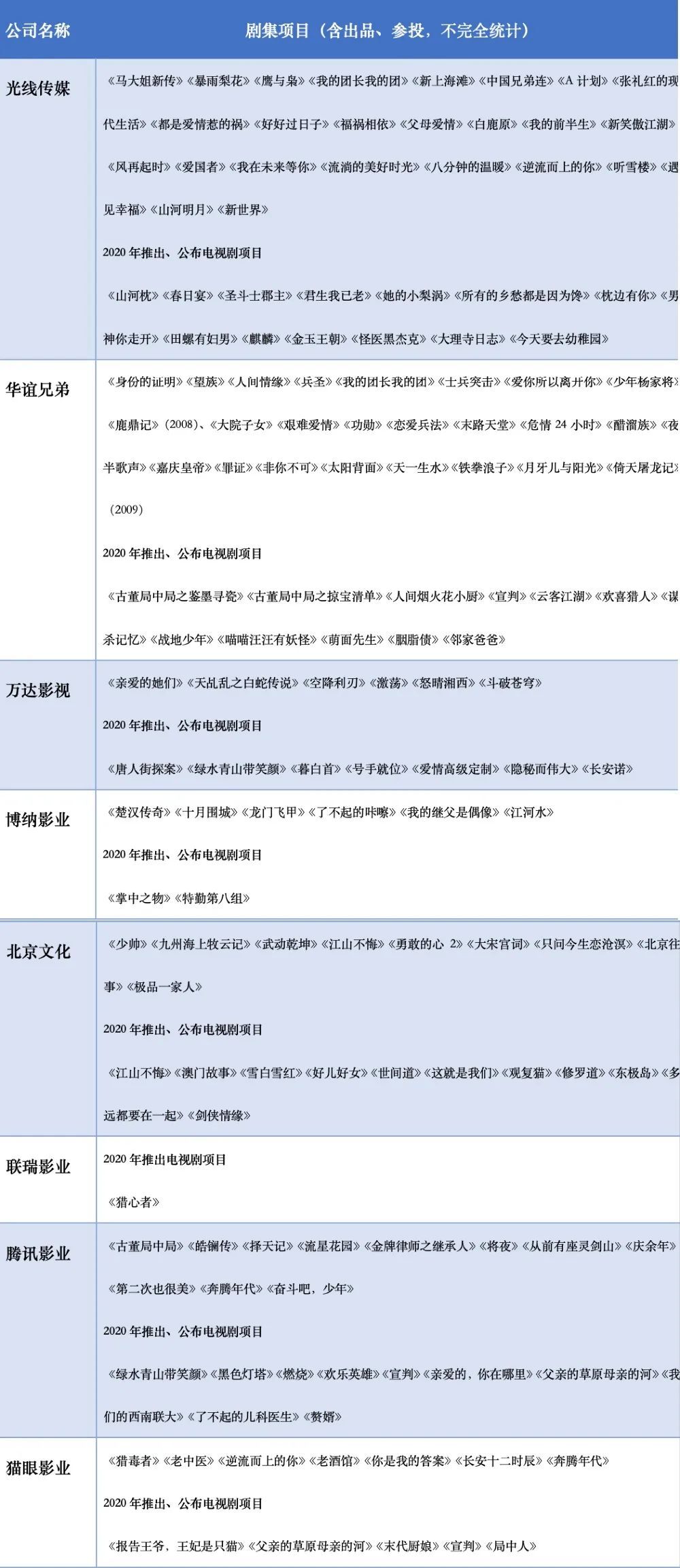 今年在剧集领域撒网最大的是光线传媒,2020年其剧集项目多达23部,早在4月20日,光线传媒就一口气发布了14部剧集片单,包括《山河枕》《君生我已老》《她的小梨涡》《麒麟》《金玉王朝》等众多热门IP改编项目。