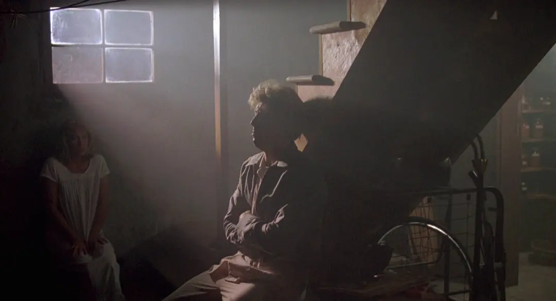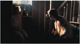 然而当演员们动起来时,光效发生了变化,整个场面变得生动起来。当男演员进一步走向女演员时,他黄色的毛衣就好比是一个移动的反光板,女演员的脸被毛衣映衬得非常漂亮。这节课所展示的是灯光的简洁性与运动性。通过利用演员的走位来调整画面中景物的亮度,克罗嫩韦思向我们强调了电影的灵动之美。除此之外,单一光源照明还为这个故事增加了张力,使该场景中二人的窗前对峙更具戏剧性。克罗嫩韦思表明,他的照明方式就是解决问题:“情况时刻在变,每个场景的问题各不相同,随着摄影师技术水平的提高,解决问题的方法会越来越多,你可以根据不同风格灵活选择。当你在选择镜头和其他器材的时候,你会自问‘我该怎么做才能得到理想的画面呢’,大多数的摄影师给出的答案是:跟着感觉走。”克罗嫩韦思把“感觉”建立在了解胶片的基础上。每部电影正式拍摄之前,克罗嫩韦思都会做很多胶片测试。他在访谈中说道:“我在很多不同的拍摄条件下试验,洗印时把这些试片调成统一的影调。通过判断光号的高低,评价试片是否曝光正确,最后得到一组通用的光号。但实拍的时候,第一天拍出来的样片用通用光号洗印出来后效果可能会不理想,那么就得再调,直到洗印光号固定下来,才可以尝试‘单光源照明’这种富有创造性的布光方式。毕竟,影响画面的可变因素太多了,每一个环节都有可能出差错。但也正是因为这种多变性,摄影师的工作才显得尤为重要。”约翰·托尔是第二位连续两届荣获奥斯卡最佳摄影奖的摄影师,在成为摄影指导之前,他在两部影片中为克罗嫩韦思做掌机员,《佩姬·休出嫁》就是其中的一部。“乔丹使用单一光源非常谨慎,我们一般不会只用一盏灯,但每场戏的照明都是从一盏灯开始构思的。在地下室的这场戏中,一开始,他只用一盏 10K灯是为了看大体效果。灯亮起来后,他发现一盏灯就够用了。这是一个看似容易的过程,其实,能够在某个时候意识到灯‘够用了’,是非常考验功力的。整场戏的强大之处在于简洁性,从构思起,到亮起第一盏灯,再到决定是否添加其他的光源……摄影师作判断的过程非常微妙。多亮起一盏灯,场景的气氛也许就全毁了,关键步骤在于判断优劣的边界。对此乔丹的判断力非常了得,他在作决定之前有时也会量量光,但那些读数对于他来说没那么重要,眼力和对摄影技艺的理解才是他的法宝。”