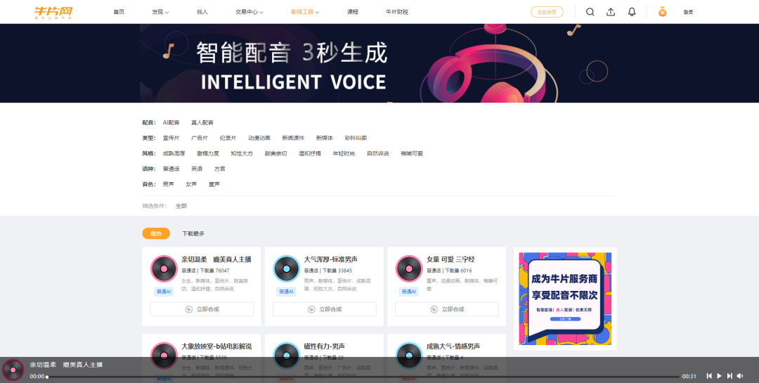 智能配音功能,AI机器人24小时全天候在线配音,不管你什么时候需要,只要进入牛片网智能配音页面,即可使用。