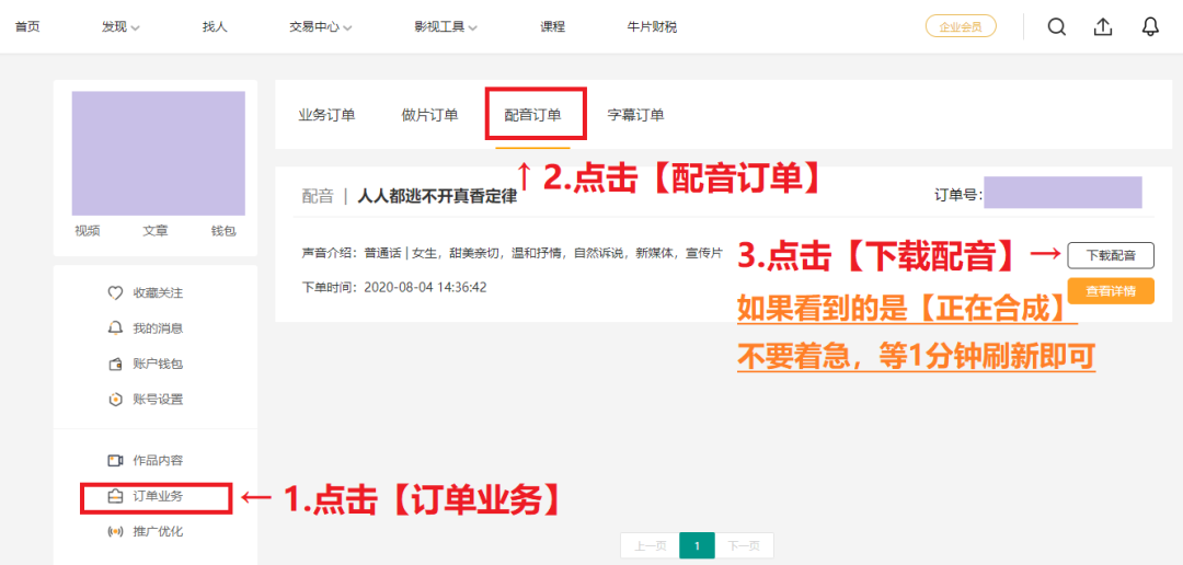 确定提交之后,系统会自动跳转到生成订单的页面。点击自己的头像,到个人中心页面,也可以轻松找到。即使没有及时下载,也不要着急,平台会为您线上托管30天~