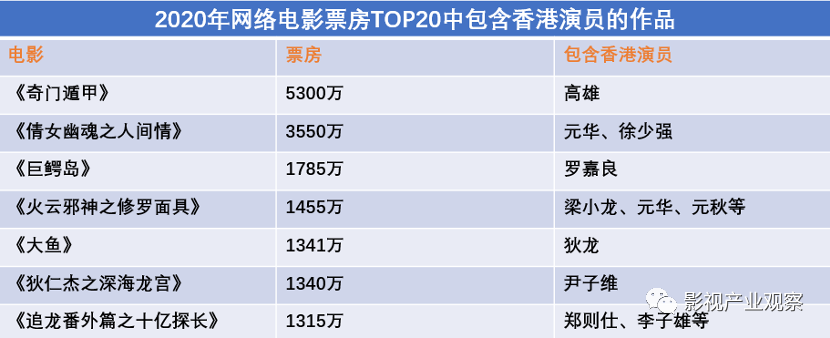 以今年上半年的网络电影市场为例,除了《奇门遁甲》和《倩女幽魂:人间情》两部独占鳌头的作品外,在头部网影中更是出现了一大批香港老牌演员的身影。其中《火云邪神之修罗面具》汇聚了梁小龙、元华和元秋等多位香港实力派老戏骨,《巨鳄岛》邀请到香港实力派演员罗嘉良坐镇主演,而香港电影中的黄金配角苑琼丹则出现在了《二郎神之怒天神将》《搜神记:南海美人蛟》《隐市奇闻录》等多部网络电影中。这些来自香港的老牌演员,毋庸置疑已成为网络电影中不可忽视的主力。