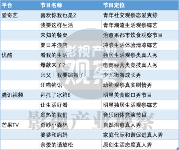 从上述对四大视频网站Q2腰部综艺的统计中可以发现,生活观察类综艺出现了明显增长,十余档节目涵盖家庭生活、青年生活、青年社交、饮食观察等类型,不仅将不同人群的真实生活搬上荧屏,也展现了各自的生活方式及生活态度。