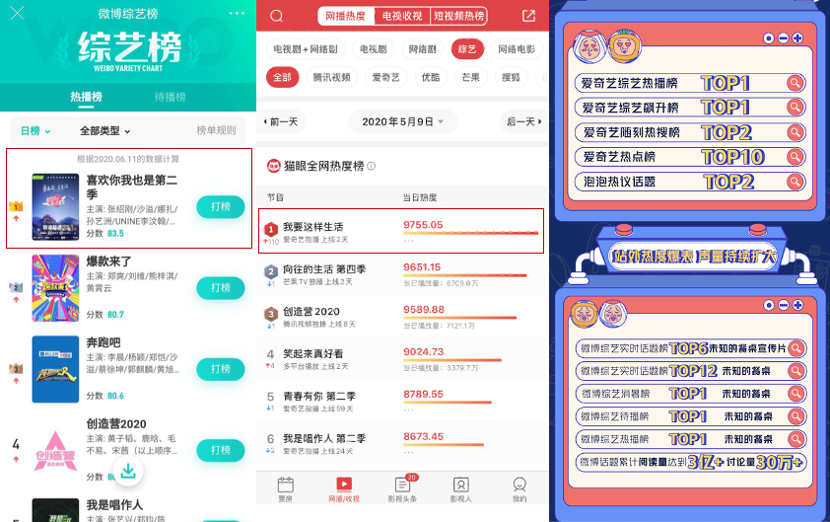 不出意料的是,这些垂直多样并紧贴用户生活的节目推出后,不论是媒体数据还是用户口碑表现都很亮眼。一是权威榜单数据领先,《我要这样生活》共登上云合综艺单日全舆情热度榜与话题榜、猫眼全网热度榜、灯塔网综榜等多榜TOP1;《未知的餐桌》斩获猫眼网播综艺、骨朵热度指数排行榜-综艺榜TOP1;《喜欢你我也是2》开播即登顶猫眼实时热度第一名,更连续六周霸榜骨朵数据热度指数榜、Vlinkage网综播放指数榜、云合数据有效播放霸屏榜等榜单。