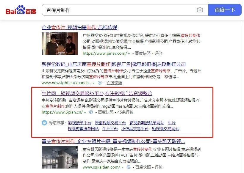 我们知道,除了业内人士,非影视行业的广告主找人合作,一般都会上网搜索,牛片强大的SEO必然会出现在广告主的搜索结果中。