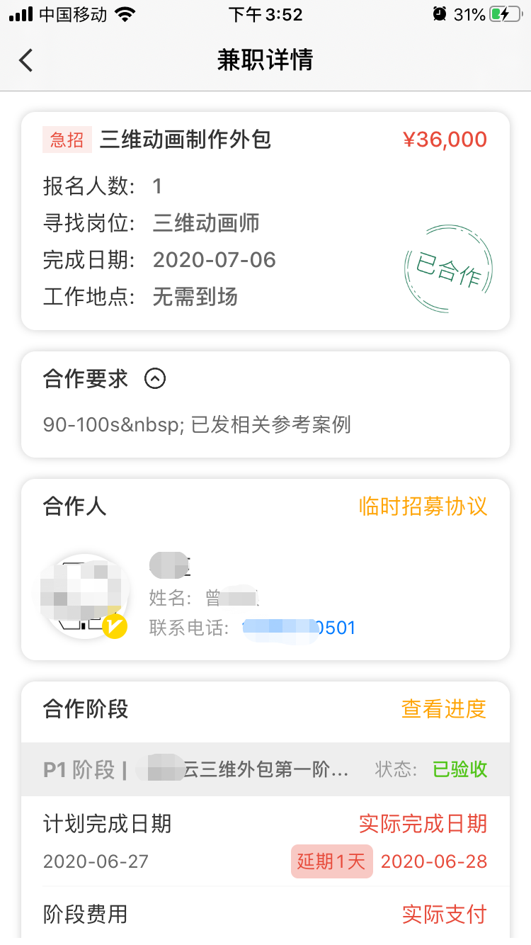 如果是需要找同行外包项目,也可以直接在app上发布任务,可筛选创作人,点击合作。确认合作后,涉及到交易费用,有两种选择,可走平台线上交易或线下自行交易结算。