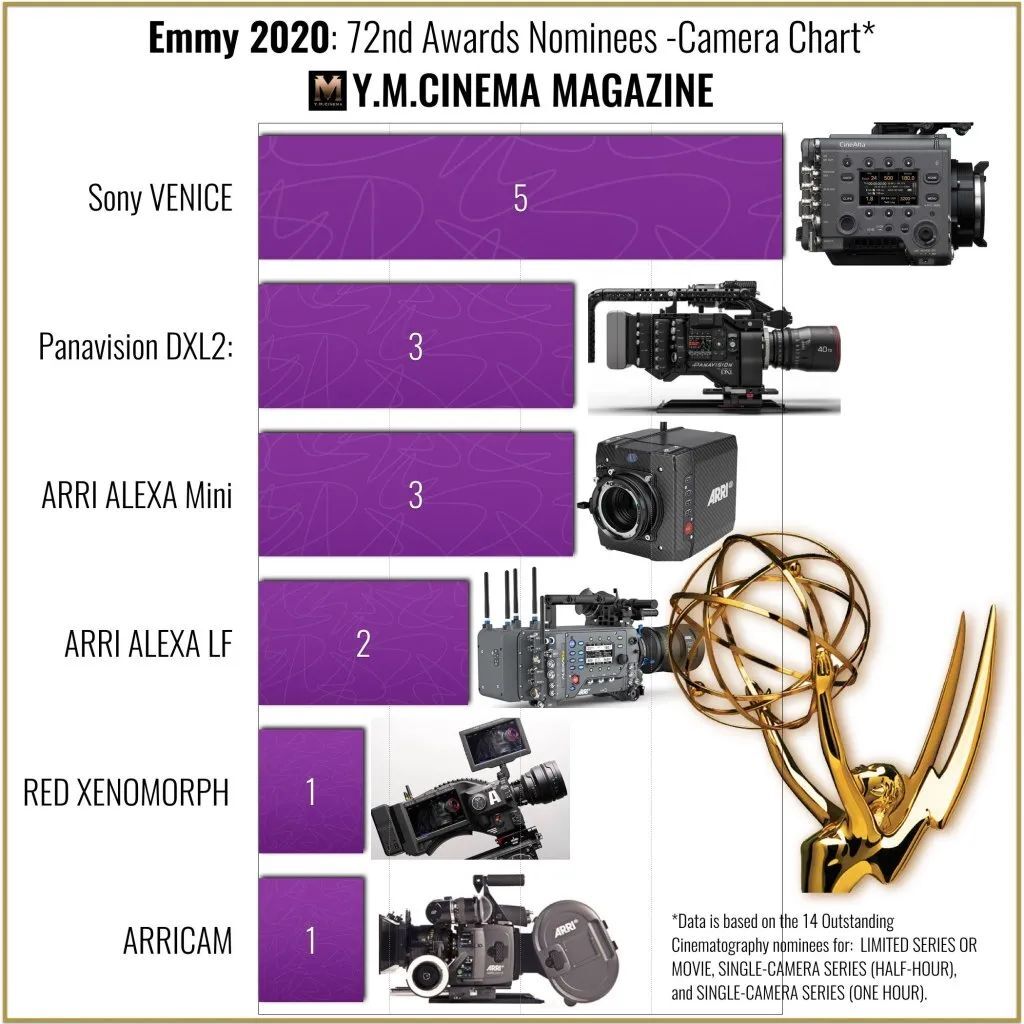 <Y.M.CINEMA MAGAZINE>的YOSSY MENDELOVICH统计了提名第72届艾美奖最佳摄影奖的作品所使用的主要摄影机。通过统计发现,Sony VENICE 摄影机引领了新的潮流,紧随其后的是ARRI、Panavision和RED。