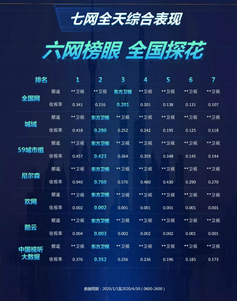 中国视听大数据发布的收视数据显示,今年1-4月,全天时段中,东方卫视在地方卫视中每日平均收视率排名第二,120天收视排名前三,43天排名第一;晚间时段,东方卫视在地方卫视中每日平均收视率排名第一。在晚间19点半至22点半的黄金时段,东方卫视每日平均收视率超过1%,收视率到达率在地方卫视中均居首位,连续18周保持前三,连续12周在省级卫视中收视率排名第一。