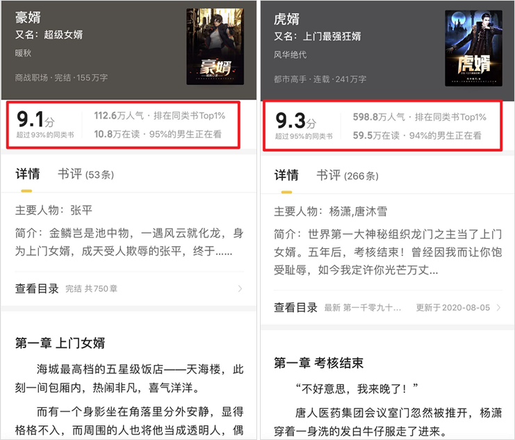 一个字都不用写,这不就是跟在家收租一样?一般情况下,只有在主站人气还不错的情况下,平台才会给作品做站外的渠道推广。毕竟,能不能让读者掏钱阅读,还得看网文本身内容怎么样。像下面图中的这两部作品,在网文平台中都属于 TOP 1% 行列的作品: