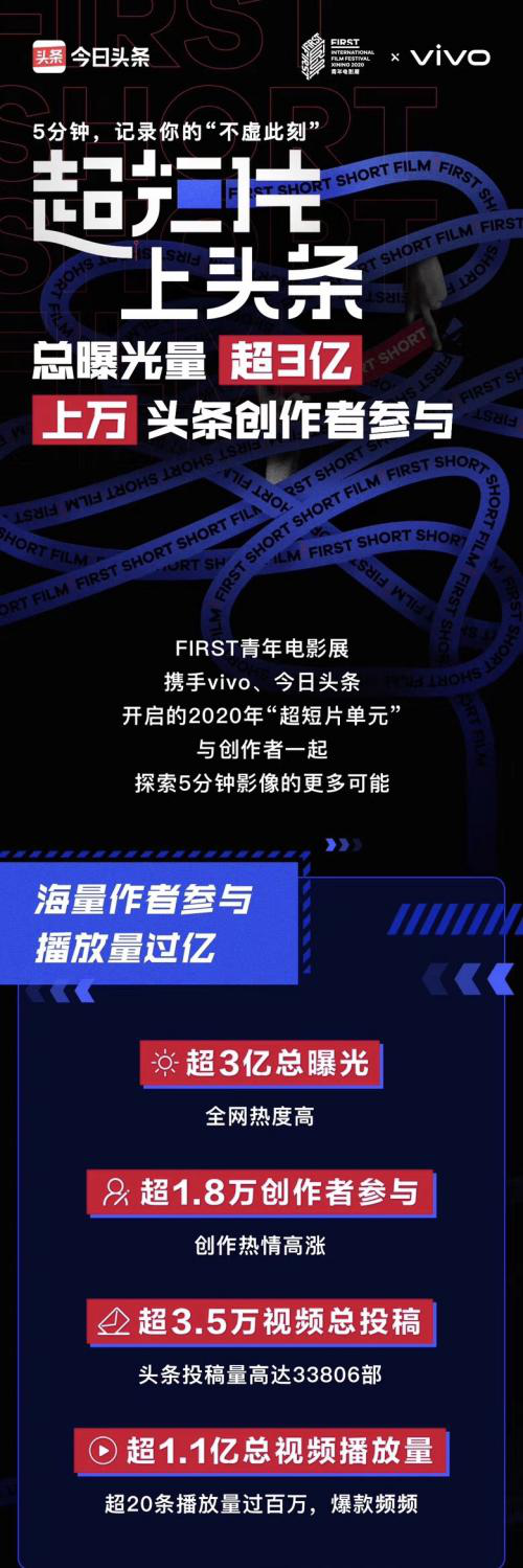 在一番仓促的翻箱倒柜中,《仓库里的结婚照》开启了阿道与晶晶的一日记录。两人的朋友、导演于昌禾是今日头条的Vlogger创作者,这次的任务来得有些紧急,昌禾为站在拼凑的红纸墙前的小情侣按下数次快门,“拍了几十张没有一张能用的,能做表情包的倒是不少”。短短的5分钟内,昌禾用幽默的镜头语言勾勒出这对北漂青年的小确幸:在快速变化的大时代里,自在天真的快乐远比形式主义的婚礼,更接近爱情的真谛。如果说拿下人文创作奖的《仓库里的结婚照》充满烟火气,获得今日头条大奖的《三月美术馆》则以天马行空的创意取胜:在名画遭到病毒侵袭纷纷戴上口罩时,身穿防护服的白衣人挺身而出。有意思的是,这部动画片由一支“家庭临时剧组”完成,导演吴锦明负责编剧与后期,黏土道具是由女儿用玩具改装的,妻子则是音乐监制、摄影兼灯光助理。返京宅家的日子里,吴锦明号召全家人以动画的形式来传递防疫科普知识,致敬医护人员,童趣十足又充满了温情。总体来看,今年入围FIRST影展超短片单元的20部影片题材类型多元,层出不穷的新媒体叙事方式甚至跳出了人们以往对于电影的界定。比如获得评审团大奖的《别拍我!》运用了13部手机同时拍摄,以自拍、他拍、视频通话等多空间镜头切换,试图让观众思考全民影像化时代人际关系的重塑;《厄运锦鲤》仅靠一个手机屏幕界面搭配大量画外音,为人们讲述了一个强反转的心理惊悚故事,堪称移动时代的桌面电影;《伤停补时》《你近视几度?》《台风到来之前》等作品,则着眼于生活中的温情点滴,令我们更懂得珍惜身边的亲情、爱情与友谊。某种意义上,超短片单元的设立是短视频时代内容众创的大势所趋,拍摄条件的便利与新媒体技术的迭代,让每个人都成为自己生活的导演,将身边动人的故事分享给更大的世界。“自今年超短片单元征片开始,两个月不到的时间内,数量上大大超出我们的预期。”FIRST影展官方头条号这样写道。作为在电影行业内知名的电影节展,FIRST此前在大众圈层尚未打破认知高墙。而此次与坐拥数亿用户的今日头条合作,短视频本身就是头条创作者熟悉的创作体裁之一,直接让FIRST影展超短片单元由业内征集变为全民参与的热门活动:活动整体投稿量35012部,其中由今日头条投稿的作品达到33806部,本次获奖影片中,《三月美术馆》与《仓库里的结婚照》就是投递到今日头条的优秀原创作品。可以说通过这次的超短片征集,今日头条正在推动影视行业人才团队的基层孵化,让更多有潜力的创作者脱颖而出,他们中的一部分人未来有望由短片走向长片创作。另一方面,头条让FIRST影展真正成为非电影圈层的年轻人进行影像探索的「第一次」,而通过激励普罗大众参与内容创作,在记录生活中不虚此刻,也进一步反哺今日头条平台的内容生态。此次借助今日头条的传播影响力,曾经代表独立、小众与文艺的FIRST影展正在逐渐走向大众视野;对头条创作者而言,FIRST影展与今日头条的合作则促成了他们人生中的导演“初体验”。比如头条的vlog作者“螺丝爱洗头”,平日擅长拍摄生活类、美妆类短视频,这次为了参与超短片单元特别尝试了剧情片创作,以《借钟》为题向观众讲述了一个返乡探亲旅程中的奇幻故事。头条的旅拍作者“古天鸡与少女蔓”则花三天时间创作了一部软科幻小片,以少女找回丧失的色彩提示人们勿忘梦想初心。随着短视频时代的到来,内容创作的影像语言、拍摄技术、传播渠道都发生了变化,基于这些因素,今日头条鼓励创作者探索出更多元的表达形式,类型不设限、创作体裁不拘一格体现了本届超短片单元征集的包容性:从专业设备到手机、运动相机甚至无人机都被纳入许可,横屏或者竖屏随创作需求任选。在今日头条的征选活动中上万部短片涵盖剧情片、纪录片、动画、实验类短片甚至难以被定义,这引发了人们关于“电影究竟是什么”的重新思考:新媒体影像的多元表达打破了第四面墙,成为我们真实生存的世界,而以今日头条为代表的创作者平台,正在集结全民创意重新定义电影的未来。独立电影看似离我们的生活很遥远,但人生又何尝不是一场大戏,每个人都有创作冲动与积极表达的权利。在此次FIRST影展与今日头条合作的超短片征集活动中,我们就发现了不少令人触动的「浮生一日」:一些人在纪录与女友的分手,一些人通过小剧场来呈现对家庭教育的反思,还有保安在拍摄自己迎来送往顾客的故事......今天超短片单元的20部入围作品在FIRST影展官网与今日头条进行线上首映,而借助今日头条、西瓜视频、抖音等字节跳动系平台的联动宣发,让更多年轻创作者的内容拥有了作品出圈的可能,即便只拥有几百粉丝,基于头条的流量推介机制同样能够获得数百万的内容点击量。入局娱乐营销不到两年,今日头条早已成为娱乐营销的头部阵地。