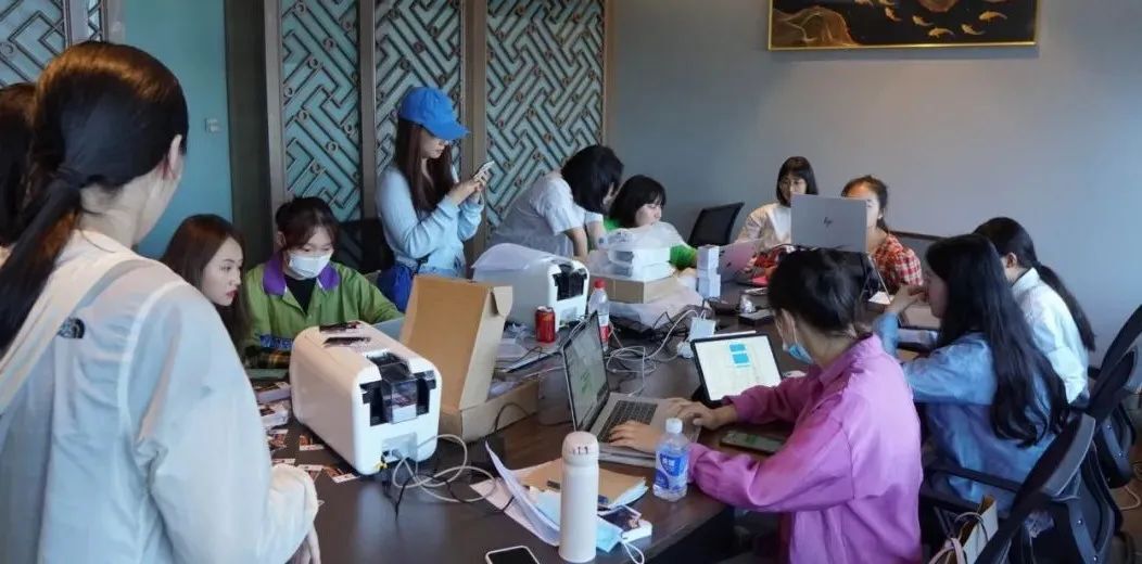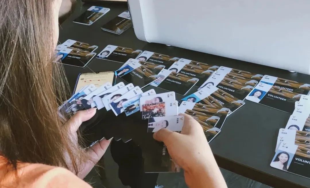 把空白的卡片放进机器里,在电脑适配的软件上确认证件信息后,证件就会被机器从容不迫地吐出来,然后按照名字首字母分类。志愿者们的比较大的心得体验是:FIRST的证件上可以放修过脸的艺术照。