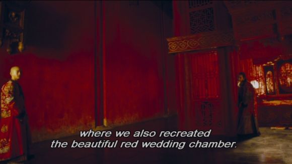 开场的红色血液引发了一段很长的闪回,溥仪经历了人生的红(出生以及在婚礼之夜再次出现)、橙(童年)、黄(看到朝拜皇帝的人)、绿(西洋汽车)、蓝(在出租车里)、靛(宫殿)以及紫(放片室)。