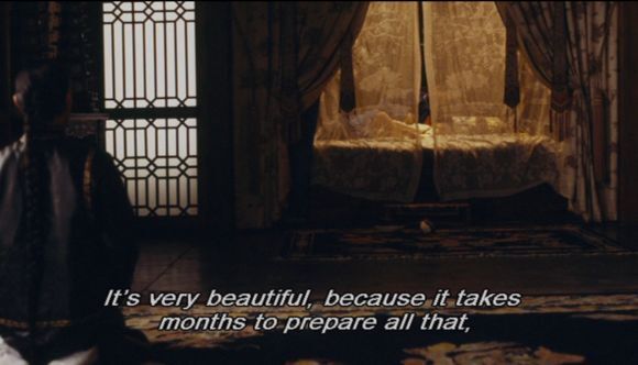 片中的刚被钦点的小溥仪自顾自离开母亲,来到了一个仿若阴间的场所。这个理论上应是慈宁宫的地点竟然烟雾缭绕,数十宫女太监着诡异袍服垂手而立。