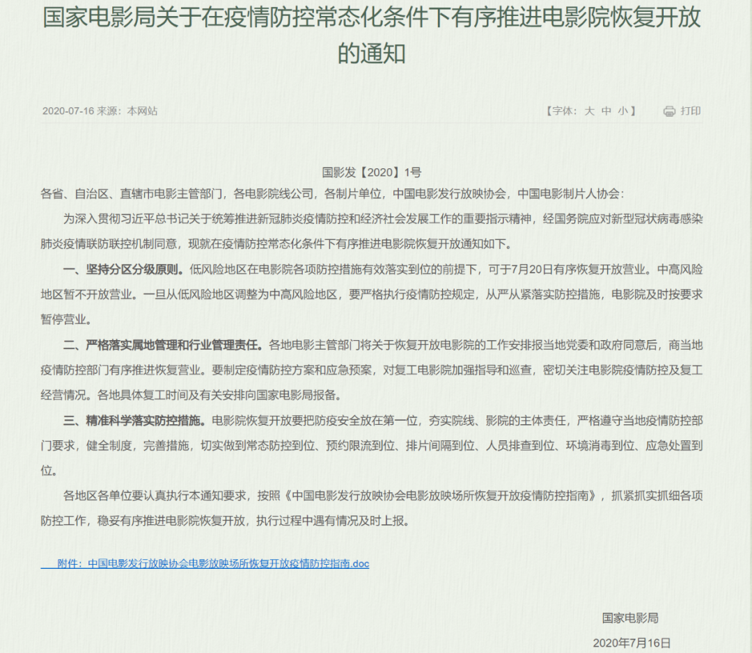 一是,昨天国家电影局发布的《电影院恢复开放的通知》中明确提到,需要“各地电影主管部门将关于恢复开放电影院的工作安排报当地党委和政府后,当地疫情防控部门有序推进恢复营业”。