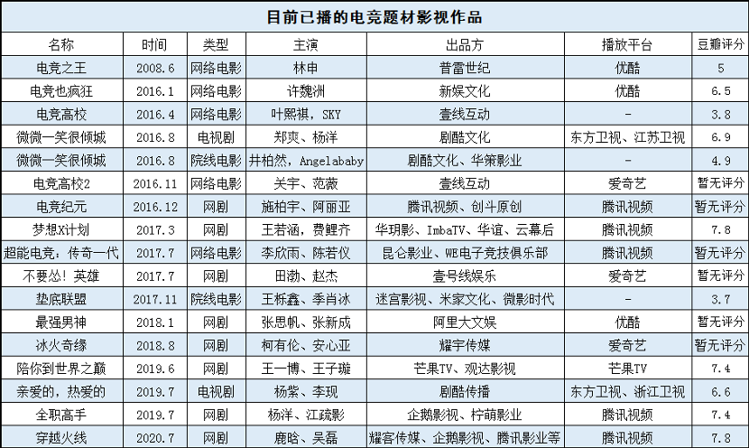 2016年,教育部增补电竞运动与管理专业,电竞完成了正名,而电竞题材的影视作品也迎来了爆发。网剧和网大也逐渐涌现出《电竞也疯狂》《电竞高校》等作品。然而,除了2017的一部《梦想x计划》拿到了7.8分的豆瓣评分,其余都以不咸不淡收场,很大部分甚至因为观看人数太少没有评分。这些作品基本都是小成本投资,制作水平粗糙,常常是新人演员担任主角,电竞职业选手客串配角,剧情也主要集中于电竞比赛和电竞选手的成长,以男性为目标受众。