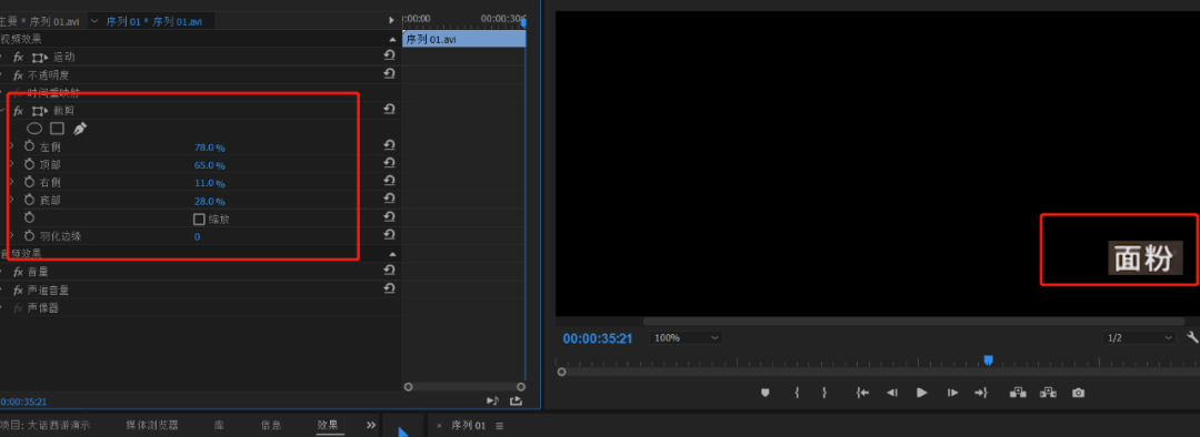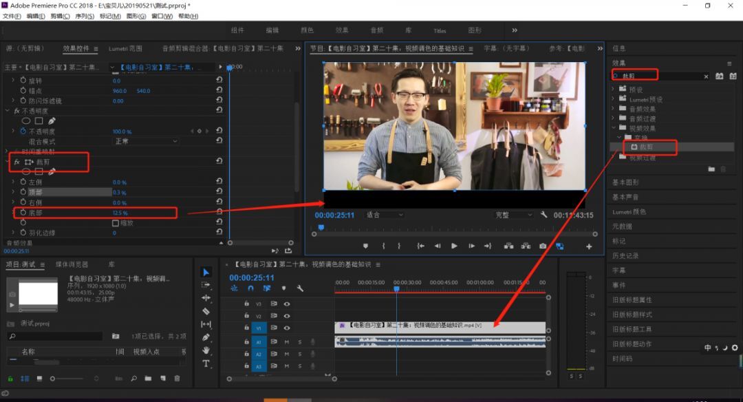 具体操作:在视频效果里找到“裁剪效果”,将其拖入视频素材中,随后调整效果控件中顶部和底部的参数值就可以了,参数数值根据具体视频字幕位置进行设置。