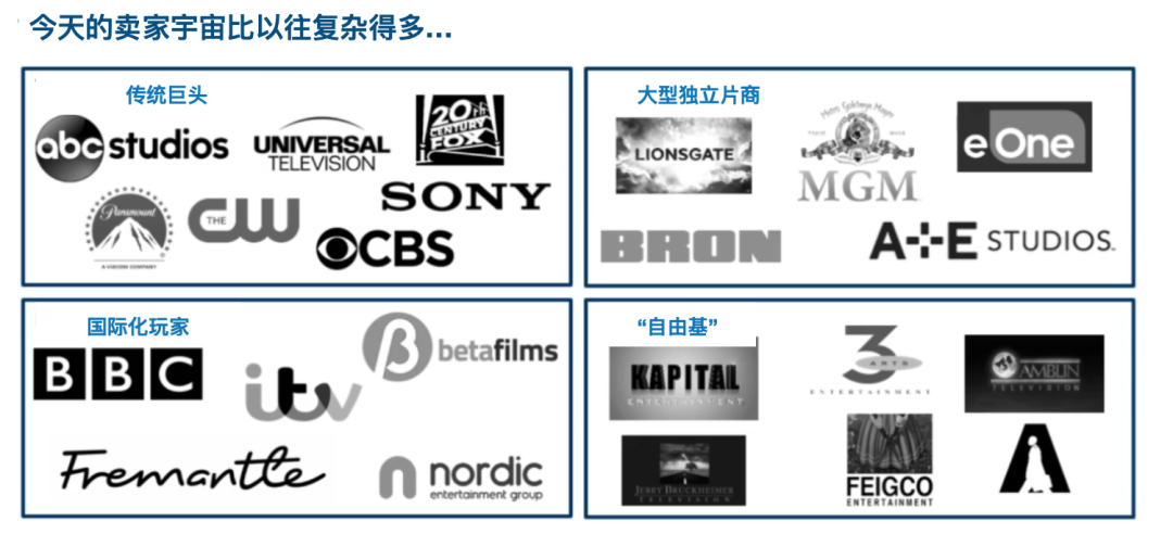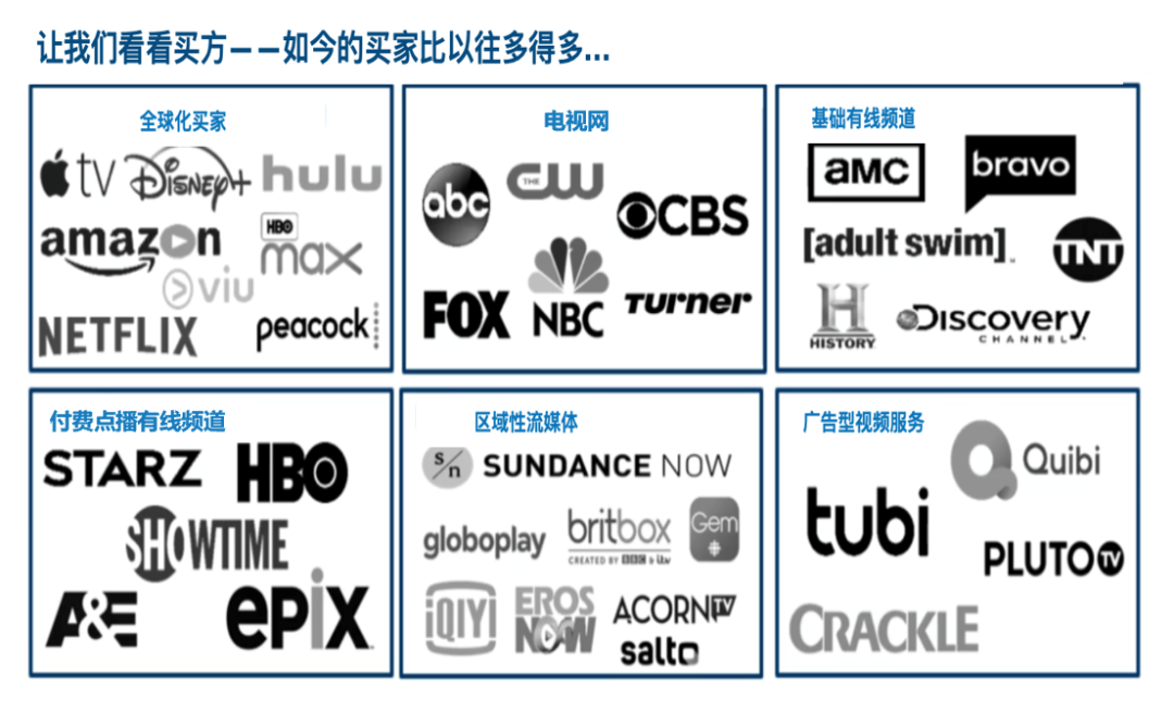 相应地,买方也变得更加多元。随着全球化买家包括免费电视网、有线电视、付费电视、地区性流媒体以及广告型视频平台纷纷入局,如今的买家比以往任何时候都多。这给卖家提供了更多渠道,但也给买家,尤其是给来自传统渠道的人造成了前所未有的激烈竞争。