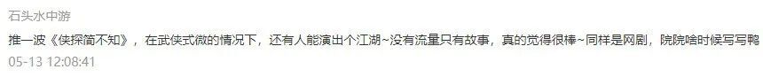 豆瓣上有网友说得很好,武侠没有死,它只是藏在每个人心底,等待被唤醒。《侠探简不知》很糊,很穷,本身破案剧情也并非全无破绽。可它唤醒了我心底曾经对江湖的向往,让我再度重温过去看武侠小说时悸动的心情。