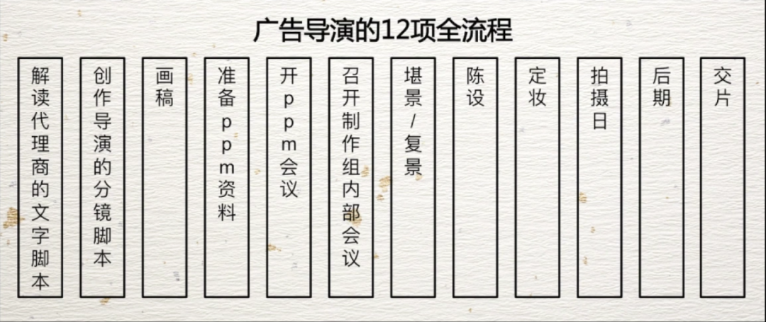 我的收获是弄清楚广告导演的工作一共有12项:解读文字脚本,创作分镜脚本,画稿,准备PPM资料,开PPM资料,召开制作组内部会议,勘景/复景,陈设,定装,拍摄日,后期,交片。
