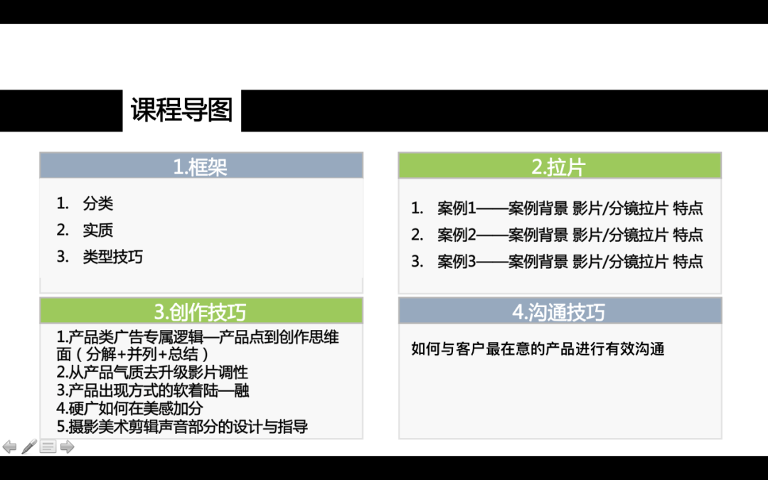 例如总结出的产品类广告的创作技巧:产品类广告专属逻辑——产品点到创作思维面(分解+并列+总结),从产品气质去升级影片调性,产品出现方式的软着陆-融,硬广如何在美感上加分,摄影美术剪辑部分的设计与指导……