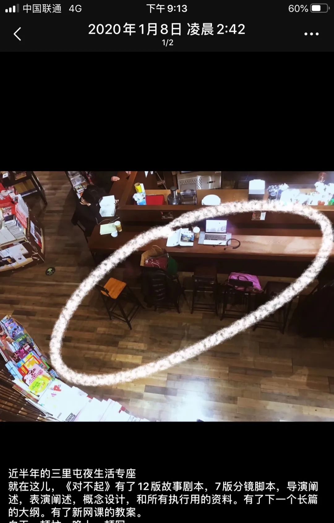去年筹备剧情片,根据我发的“三天可见”的朋友圈统计,我全年有60多个夜晚在书店写到天亮。写完了第一部剧情片的12版故事剧本,7版分镜脚本,导演阐述,表演阐述,概念设计,和所有执行用的资料以及现在筹备的长篇剧本大纲,项目计划书,以及一套导演课线上课的教案。