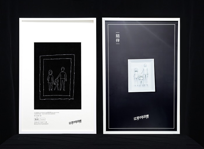 我们把8个关键词做成了白发艺术装置,前面是由2020位年轻人白发组成的艺术绣,后面是由3D打印技术完成的关键词模型。