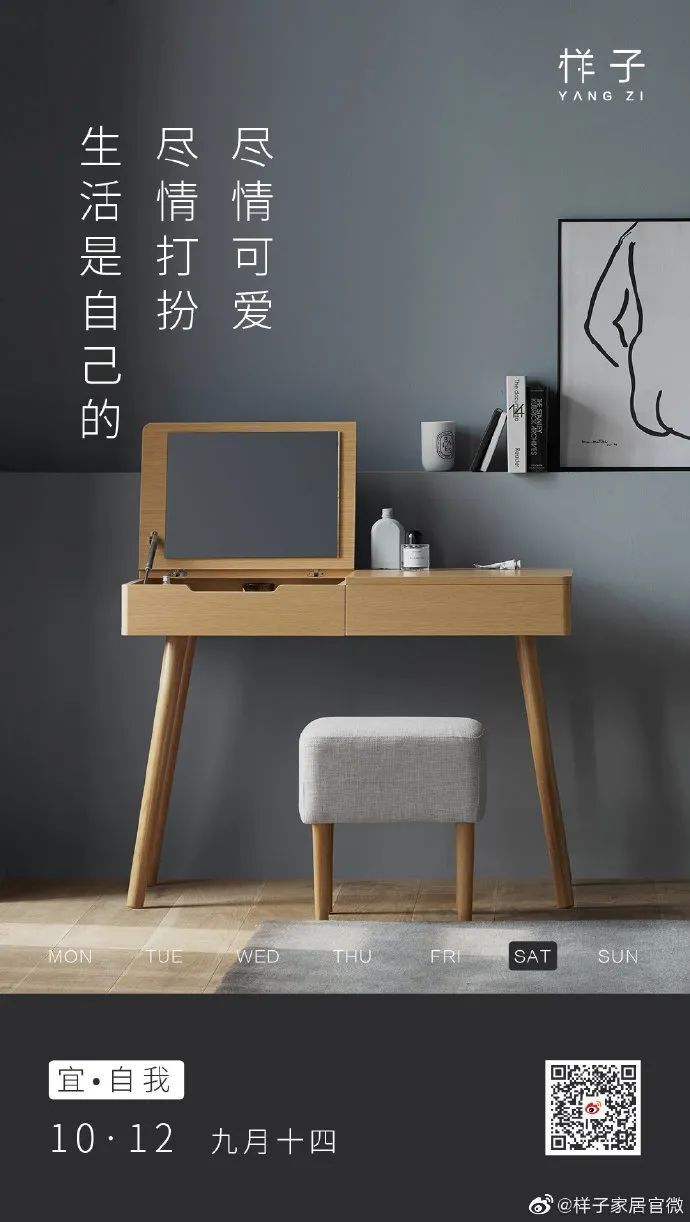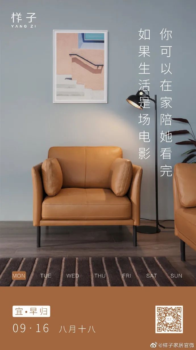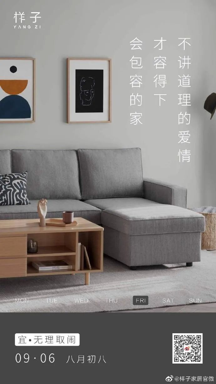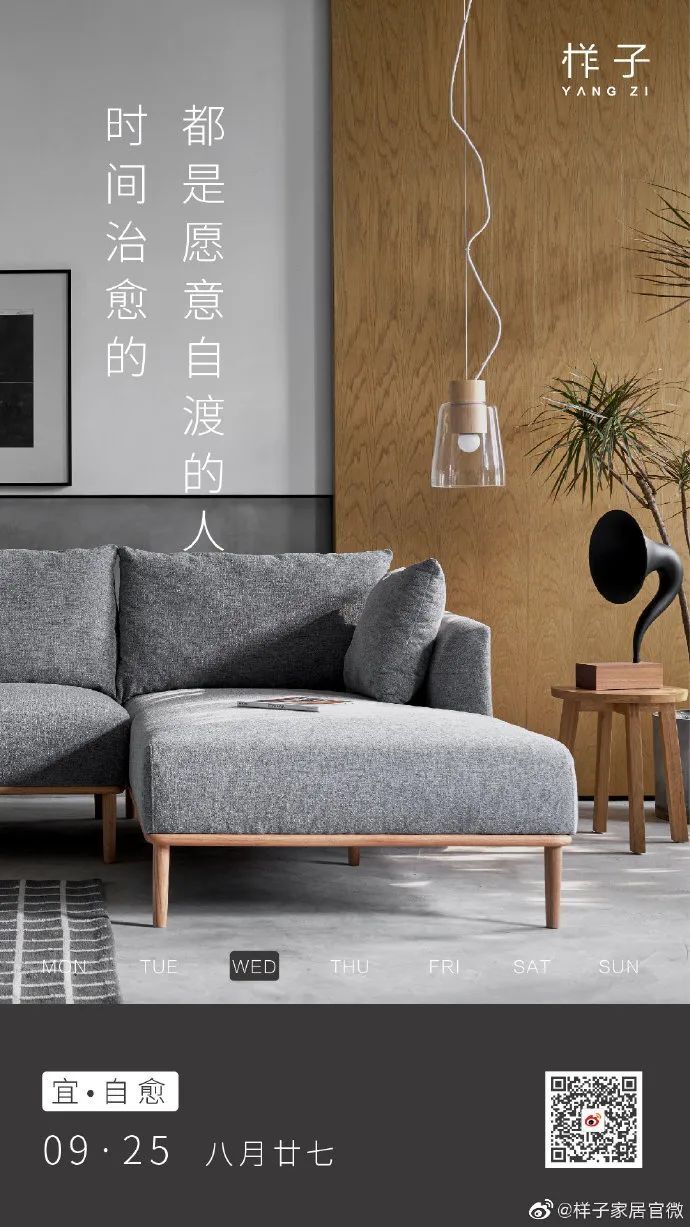 近两年,不少品牌在社交媒体运营排布上喜欢用“日历”这种形式来填补日常推送内容,很多只是为了推而推,问一些无关痛痒的问题,实在是对资源的浪费!样子生活的品牌官方微博做得比较有头脑,“每日一签”这个话题之下,单独配一张海报,视觉上赏心悦目,文案则不放过任何带货or贩卖生活方式的机会,实在会玩,我们挑几张来品品。