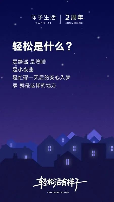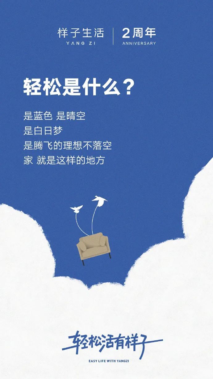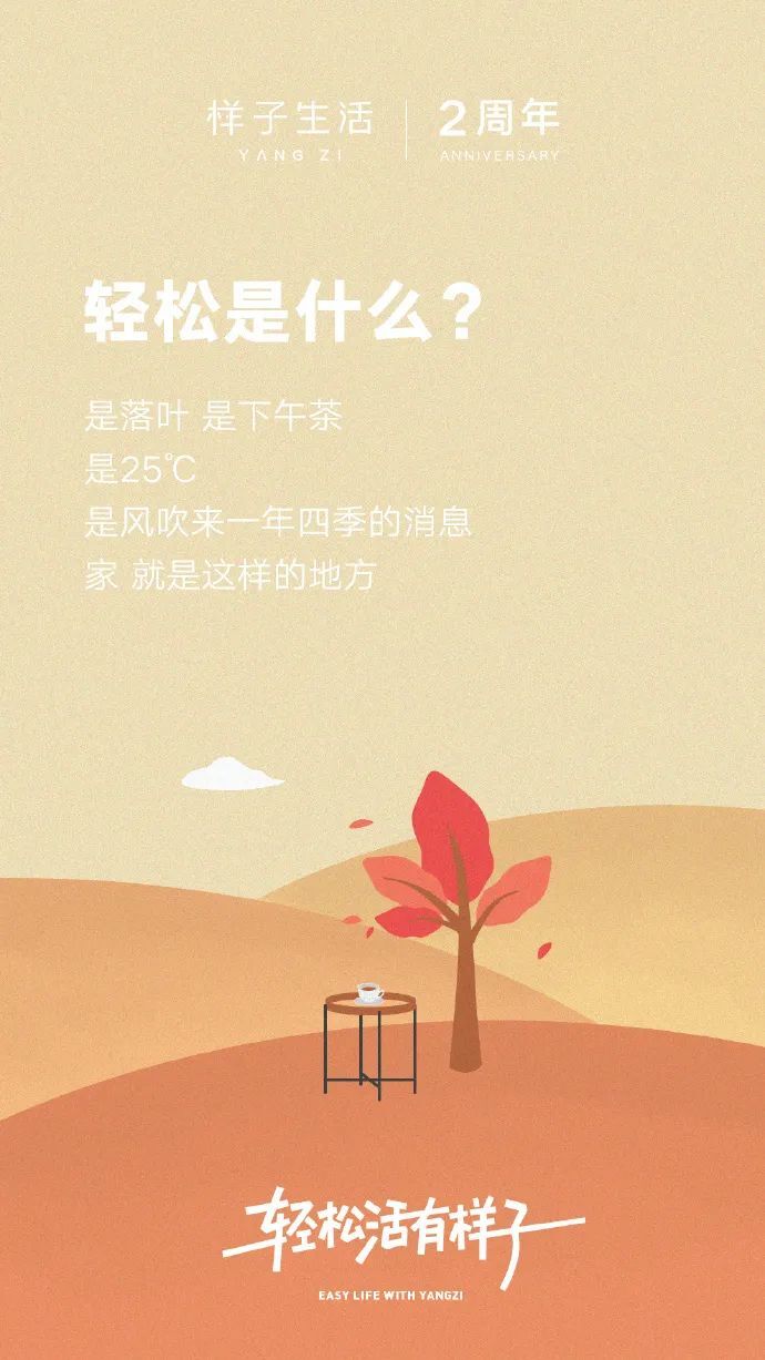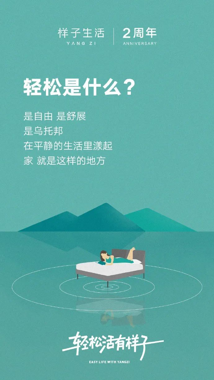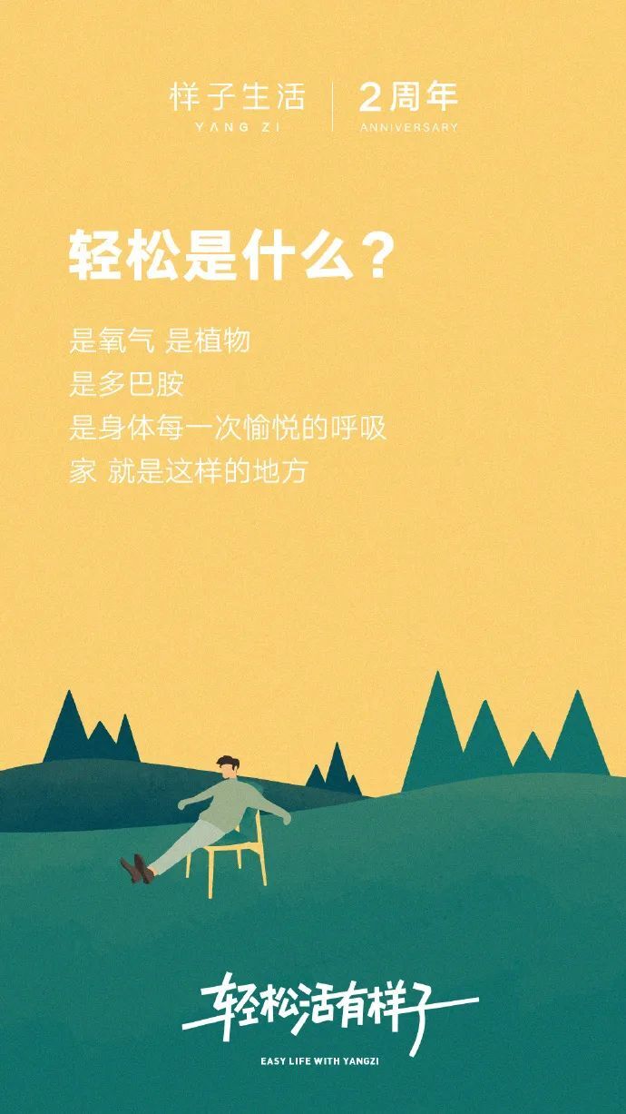 这种轻松、舒适感,贯穿产品和海报,直达消费者的心里,就像样子生活在2周年之际推出的一组插画海报“轻松活有样子”,是对理想生活最具禅意的诠释。