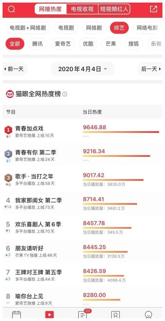 一方面,衍生节目在内容和形式上拥有不小的发挥空间,既有深度访谈、生活记录,也有竞技游戏、互动娱乐,实现了对不同圈层用户的精准投放。在正片影响力的加持下,往往表现出不俗的引流能力。今年4月,《青春有你2》的衍生节目《青春加点戏》,热度曾一度超过正片,拿下了猫眼综艺全网热度榜榜首。