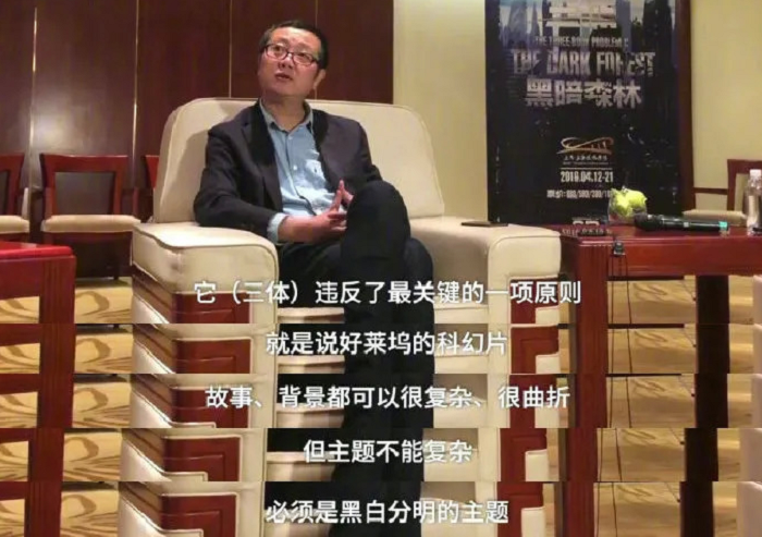 此外,《三体》的作者刘慈欣一直都被很多专家誉为“硬核作家”,原因便在于其在写作《三体》时融入了大量现实中的前沿物理学理论,并进行了适度拓展。一方面这些理论对于普通观众和读者来讲难以理解和驾驭,另一方面即使目前的电影技术已经足够强大,但依旧难以充分呈现小说中出现的那些抽象的科学概念和宇宙景观,尤其是以中国电影目前的工业成熟度来讲,并不足以驾驭《三体》中那些宏大的世界观和天马行空的想法。此外,刘慈欣本人也曾坦言,与主题“非黑即白”的好莱坞科幻电影不同,《三体》中的主题和价值观非常复杂,难以改编。