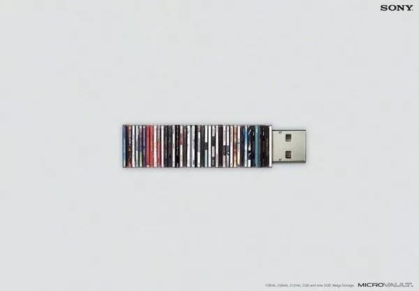 索尼也有一个创意广告,就跟比尔盖茨的做法类似,把U盘的存储功能与过去的CD连接起来:一个小小的U盘就抵得上一堆的CD,新时代来啦。