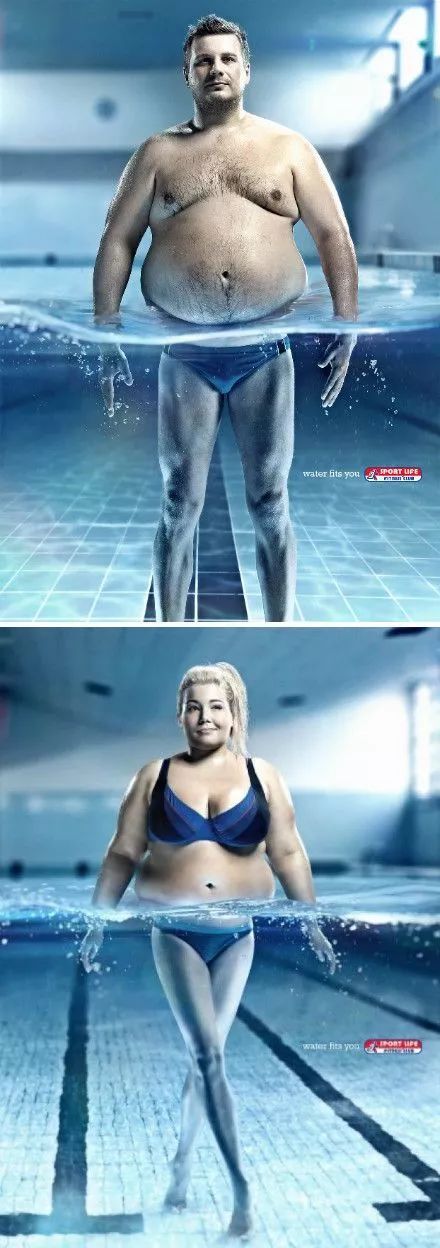 但我后面专门去找到他们完整广告后,服气了,难怪获奖。海报里加了水上水下的参照后,马上就告诉你:水能达到如此的塑身效果,为什么不经常来游泳呢?