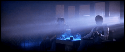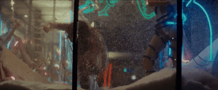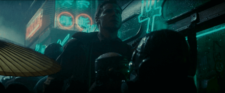出于种种原因,特技摄影总监之一的大卫・德赖尔在大多数场景的制作中总会和黑白洗印打交道,他甚至希望电影能以黑白的形式放映,因为他认为黑白版的《银翼杀手》似乎更有深度、更具风格。当然,这不是说克罗嫩维斯的工作有任何问题,而是指,《银翼杀手》的影像风格其实是一种令人怀旧的表现形式。正如影片的其他方面,克罗嫩维斯将经典影像的摄影传统进一步发扬光大,为此,他甚至对色彩进行处理,在通常被认为会有颜色的地方,却让颜色消失。“我们使用反差、逆光、烟雾、雨还有闪电来赋予影片个性和情绪,”克罗嫩维斯说:“街道被描绘得极度拥挤,这是为了给观众一种关于未来时空的印象。我们让街景填满人…像蚁群一样。索性,我们让他们看起来也像蝼蚁——所有人都一样。这些人形成人流,像在绕圈,又像在漫无目的地走,在这个意义上,这些人都是相同的。而在摄影上,我们则将他们处理成无色。”既然街上的群演都是无色的,那么洛杉矶街景的布景重点就在于突出角色,以及各式各样的霓虹灯构成的街头光线气氛。我们从《旧爱新欢》[1981,维托里奥・斯托拉罗摄影]剧组借来大量霓虹灯,为了让画面看上去真实可信,画内霓虹灯的调压器通常被设置为光线出现频闪以前的数值,同时,画外的霓虹灯则尽可能开到最亮,以作为主要的[环境]光源。当现场的霓虹灯不足以照明,或无法起到装饰效果时,我们会立刻做些新的,并放至我们想要的位置。一个例子是,我们要在德卡(哈里森・福特饰)跑过的路边陈设[霓虹]字母,还要在巴士里贴灯条,当时我们有个7人小队,不干别的,就专门负责这些霓虹灯。因为它们的数量远远超过了现有的调压器,因此,拍这场戏时,我们总是在拆东补西。克罗嫩维斯增设霓虹灯有其理由:“我们需要一些光线上的重点来突出影调,必要时让街景灿烂夺目,以及突出物体或角色。使用逆光结合环境[气氛]光来照明场景,实际上不难理解。”现场的霓虹灯足够亮,让克罗嫩维斯得以拍摄一些高速镜头:“在德卡追捕‘蛇女’复制人若拉(乔安娜・卡西迪饰)的段落中,剧本需要她冲向一连串的玻璃橱窗。美术指导搭好符合这一动作的店铺,但是到了装饰阶段,雷德利却对第一次的结果不满。美术组将所有装饰撤走,并在一周后提交了新的方案,可是雷德利还是不喜欢。最后,老雷自己想到个好主意,他取走一些街景上的霓虹灯,并把它们放进橱窗,结果证明效果很好。接着,我们以多机位、不同帧率拍完了整个追逐——有正常镜头,也有升格镜头,这造成一种脉动般的效果,这种情况不会出现在正常帧率下,但是以高帧率拍摄就会特别明显。我们认为脉动也是这场追逐戏的元素之一,因此顺理成章地接受了它。”另一个例子是对色光的大胆使用,在场景“塞巴斯蒂安的玩偶屋”中,期间,德卡碰到了另一个复制人普瑞斯(达丽尔・汉纳饰)。普瑞斯脸上铺满白色粉底,整个场景则氤氲在玫瑰[粉]的光线之中。色光偶尔也被用来给复制人的眼睛创造一种特殊效果:“辨别复制人的特征之一是他们的眼神带着一种异常的发光感,”克罗嫩维斯说:“为了实现这种效果,我们使用了一种双向镜子[two-way mirror]——50%的透光率,50%的反射率——并把它以45度角放在镜头前,然后对准镜子射出光,让反射回来的光线顺着镜头光轴与眼睛叠到一起。我们有时使用非常轻微的色纸给眼睛增添色彩。通常情况下,我们会同时拍摄有和没有这种效果的镜头,这样雷德利就知道他到底用还是不用。”然而,探讨《银翼杀手》的摄影,克罗嫩维斯却强调说技巧并非最重要的考量。“《银翼杀手》在摄影上的独特之处不在于用了什么设备、色纸,或者光有多硬又有多柔,”他强调说:“而在于每一次叙事背后的观念。既然影片的背景设定在未来,那么一些特殊光源就得以出现在现实生活中人们无法接受的位置。比方说,街景上的很多人撑着雨伞,而荧光灯管与雨伞的伞把结合到一起,便成为照亮他们脸的光源之一。”克罗嫩维斯尤其强调逆光与反差。“我从来不会认为逆光太强,”他说:“只是一些导演想看清演员的脸,而我总是告诉他们,观众只会面对性爱场面时需要。”电影摄影师对营造某种情绪或者某种效果的兴趣,与为演员打光是一样。他倾向于用柔和的顺光以及硬朗的逆光,虽然如此,他补充道:“我也很喜欢脸上过曝的硬光,我觉得它们很美,与众不同,令人兴奋,甚至有那么一些生猛。”“《银翼杀手》是一部追求极致的电影,自然也是极致光影的集合,它是戏剧性的[光效],但在影片里却异常真实,我相信你们可以接受,因为,它已经超越了戏剧性本身。”除了使用柔和的正面光,克罗嫩维斯也经常从低角度为人脸照明。除了发光的伞把,在某些场景中,他经常利用水或其他反光面来制造上冲光[uplight,脚光属于其中一种]。对前景使用柔和的上冲暖光,而对后景使用硬朗的逆光并配合烟雾,这种组合可以说是《银翼杀手》中最为典型的照明特征。《银翼杀手》在摄影上的另一个重要元素是对光束的使用。“这是我与雷德利都有想到并讨论过的点子,”克罗嫩维斯透露说:“我们交流了想法,之后光束成为这部影片的摄影主题之一。我们以不同的形式,反复加以利用。为了让光束不断在电影里出现,我们设计了一些在夜空中巡游的飞船,它们的底部发出非常强劲的光束。在未来的生
