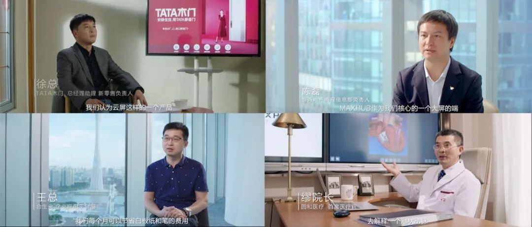 TVC结尾,MAXHUB客户广州越秀地产流程信息部负责人、TATA木门新零售负责人、合生元企业应用平台部负责人、圆和医疗首席医疗官等分别从各自的角度阐述选择MAXHUB的理由,真实而有力量,无疑对品牌而言是最好的安利方式。可以说,从企业到普通大众,以真实可感的场景内容传递产品价值,赢得用户信赖是MAXHUB双向出击直面核心用户诉求的高明之处。