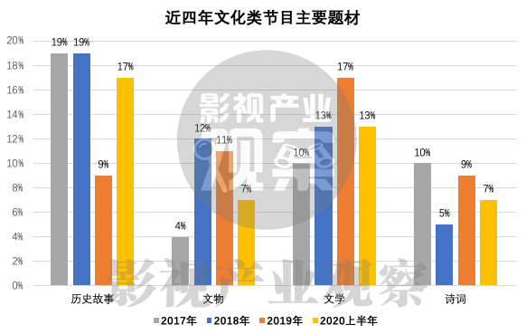 据统计,2020年上半年文化类节目中前三大题材分别是历史故事、文学和地理文化,三者都达到了10%以上;第二梯队为饮食文化、文物、诗词和汉字,均为7%。在这之中,地理文化和饮食文化是新兴的两种题材,《你要去哪儿》《我的城我的歌》《探世界》等对城市乡镇进行探访,《非遗美食》《家宴》等聚焦于中国的传统美食。