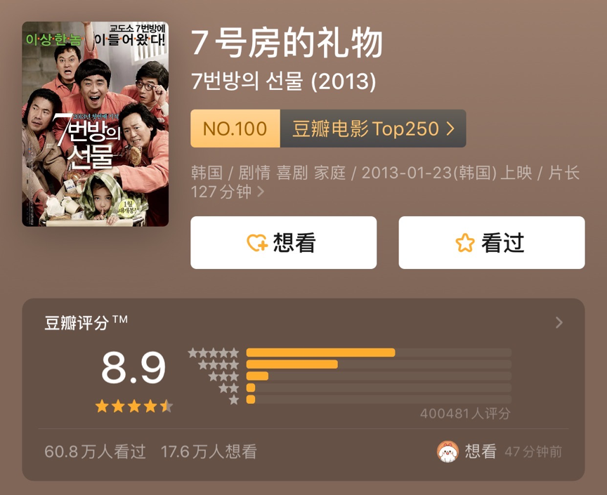 在7年前,一部韩国监狱题材影片被观众评为年度最催泪的电影,一举拿下韩国票房的总冠军,并且被提名韩国三大奖青龙、百想、大钟的最佳影片。豆瓣60.8万人给出了8.9的高分,90 %都打了四星及以上,有网友感叹“从头哭到了尾”“着实让人感动,不由得泪流满面”!